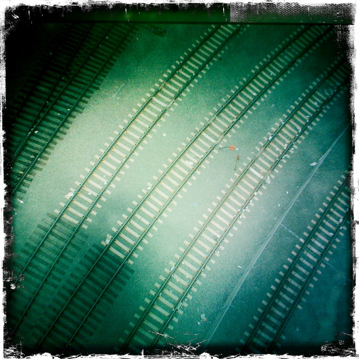 It’s a freight line, Adele had said. It’s still used. I counted one hundred and twenty one cars one time. Tim squatted down looking up the line where the rails disappeared into the distance. He sat on the middle of a tie and put a hand on each iron rail. I’ll feel it coming before I see it. And then he lay down, his arms outstretched. Come on up here, he said. It’s too steep, she said.