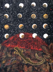 [CM]: This issue of r.kv.ry features some gorgeous artwork by Suzanne Stryk, and “Eclipse Salamander,” which accompanies your poem, might be my favorite. Do you happen to know if there was any purposeful arrangement among the artwork and text for this issue, specifically as related to “Absentee” and “Eclipse Salamander”? And whether their arrangement was or was not purposeful, how do you see Suzanne’s work as complementing (or complicating) your poem’s narrative?