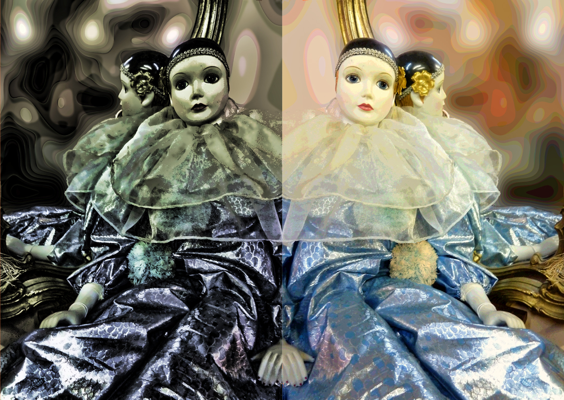 I am exploring this theme visually in photography too. For example, I made a photograph called “Night and Day.” Here the same female doll is inverted, back to back with herself. Each doll also looks into a mirror, so two outer mirrors enclose the image. The bright shapes in the mirror on the right are sinister wolf shapes in the mirror on the left.